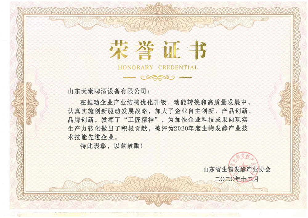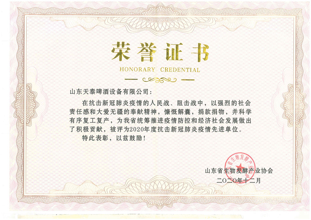 大會(huì)表彰了“山東省生物發(fā)酵產(chǎn)業(yè)協(xié)會(huì)抗擊新冠肺炎疫情先進(jìn)單位”、“生物發(fā)酵產(chǎn)業(yè)技術(shù)技能先進(jìn)企業(yè)和先進(jìn)個(gè)人”。山東天泰啤酒設(shè)備有限公司被授予“抗擊新冠肺炎疫情先進(jìn)單位”和“生物發(fā)酵產(chǎn)業(yè)技術(shù)技能先進(jìn)企業(yè)”榮譽(yù)稱號(hào)。
