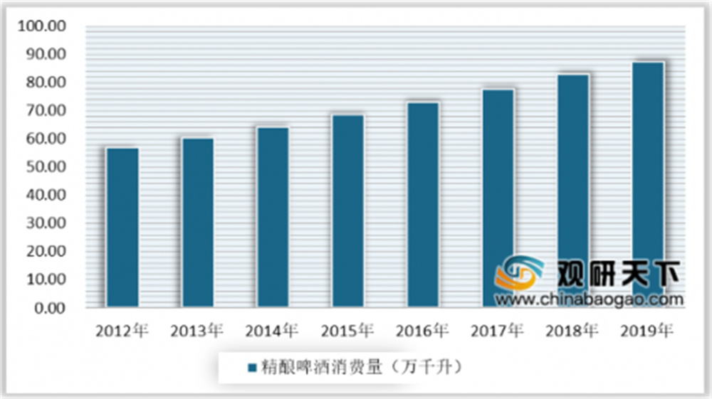 近年來中國啤酒產(chǎn)量持續(xù)下滑,而中高端啤酒消費則持續(xù)增長,推動了精釀啤酒市場發(fā)展。數(shù)據(jù)顯示,2018年中國精釀啤酒消費量在82.9萬千升左右,占啤酒消費量的2.1%,2019年中國精釀啤酒消費量為87.3萬千升,約占啤酒消費量的2.4%。